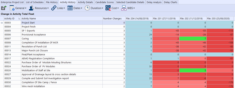 Investigate how attributes (e.g., Constraint, Predecessor, Start) have changed throughout the project’s progress.
