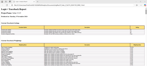 Provides full log details outlining the settings, traceback attribute weights, files and reasoning for excluding activities from critical path.