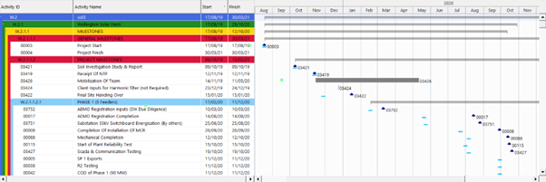 - Activity IDs indicate the start, duration, and completion date of each activity.