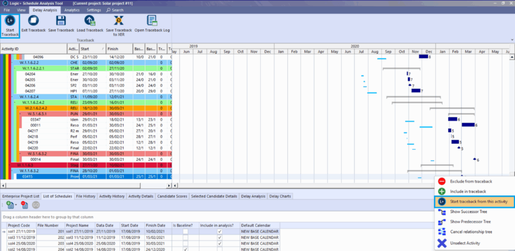 Right click activity in Gantt view > Start traceback from this activity The traceback will start at the activity that is selected in the Gantt view. A grey highlight bar indicates which activity is currently selected.